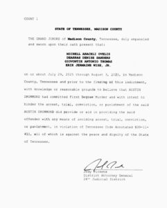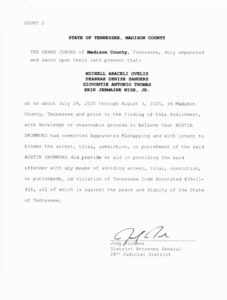 Several weeks ago, authorities charged Austin Drummond with a set of felony charges in connection to the murders of James M. Wilson, Adrianna Williams, Cortney Rose, and Braydon Williams in Tiptonville on July 29th. He was a fugitive for seven days before police arrested him in Jackson on August 5th. 29-year-old Tanaka Brown, 29-year-old Giovontie Thomas, and 23-year-old Dearrah Sanders also face charges in connection to this ongoing investigation.