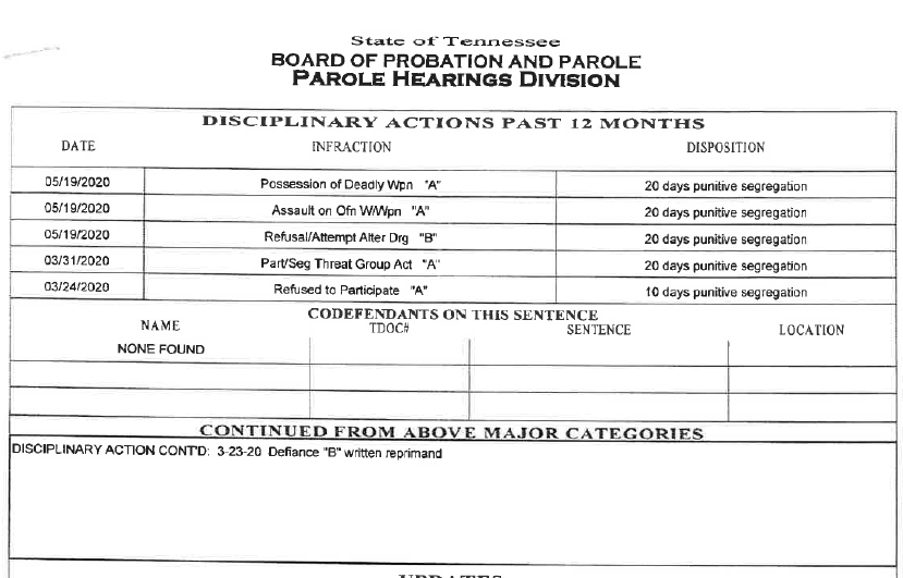 - Incarceration included over two dozen disciplinary violations, such as possession of deadly weapon, assault, refusing drug tests, and gang-related activity.
