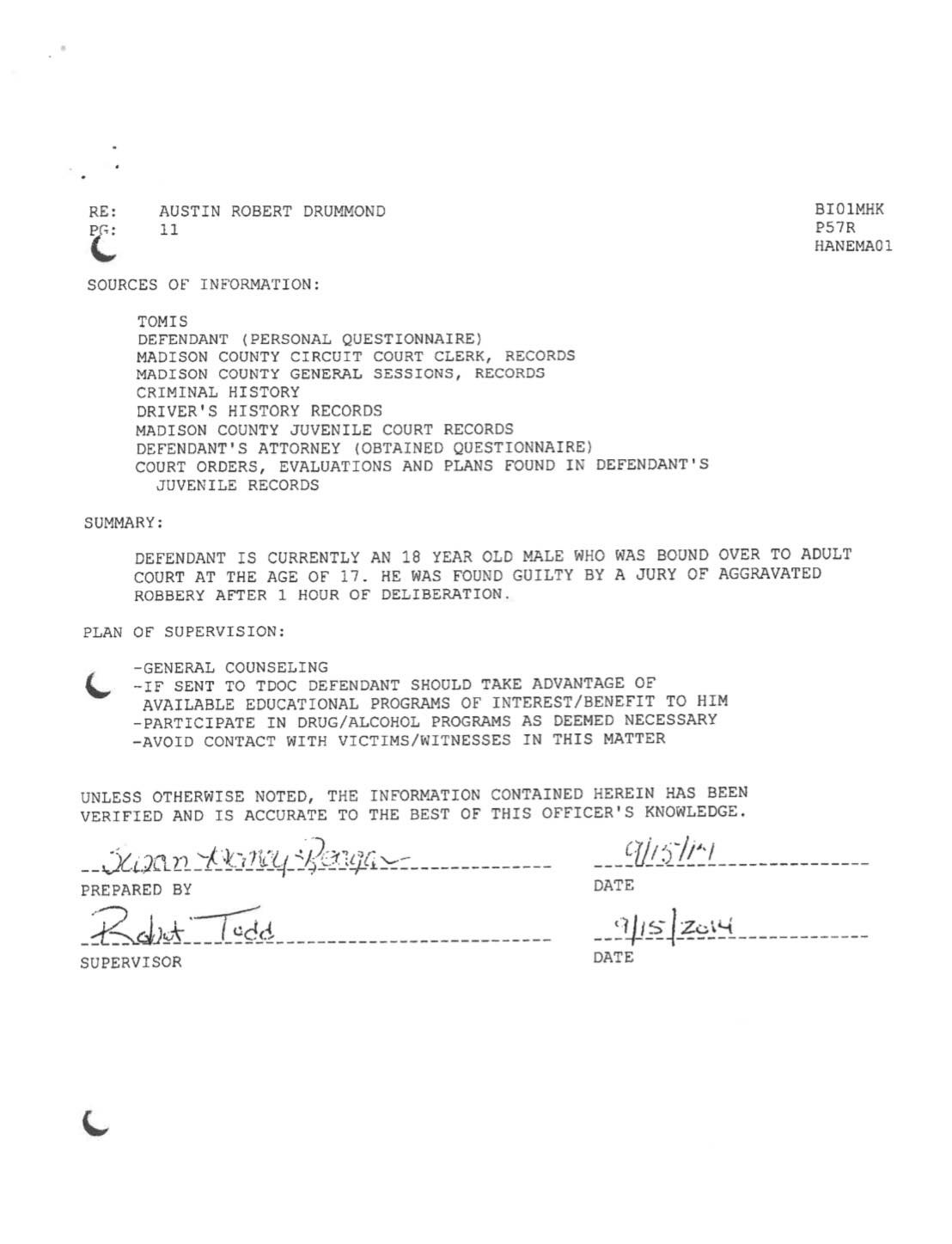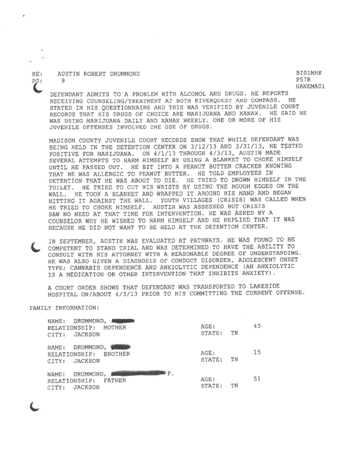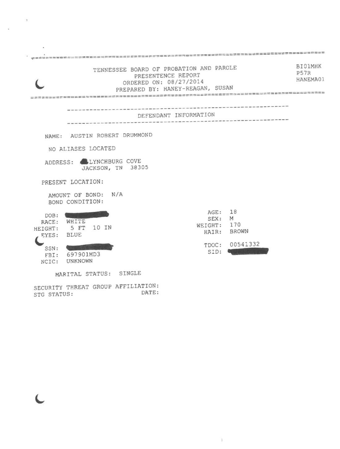 - TBI names Austin Robert Drummond (28) as the suspect. Officials note his previous relationship with the victims; investigation intensifies. TBI Agents obtained warrants for Austin Robert Drummond (DOB 8/31/96), charging him with four counts of First Degree Murder, one count of Aggravated Kidnapping, four counts of Felon in Possession of a Firearm, and one count of Possession of a Firearm During the Commission of a Dangerous Felony. At this time, Drummond remains at large and should be considered armed and dangerous. Anyone with information concerning his whereabouts is asked to call 731-415-7962, 731-333-0811, or 1-800-TBI-FIND. Source
