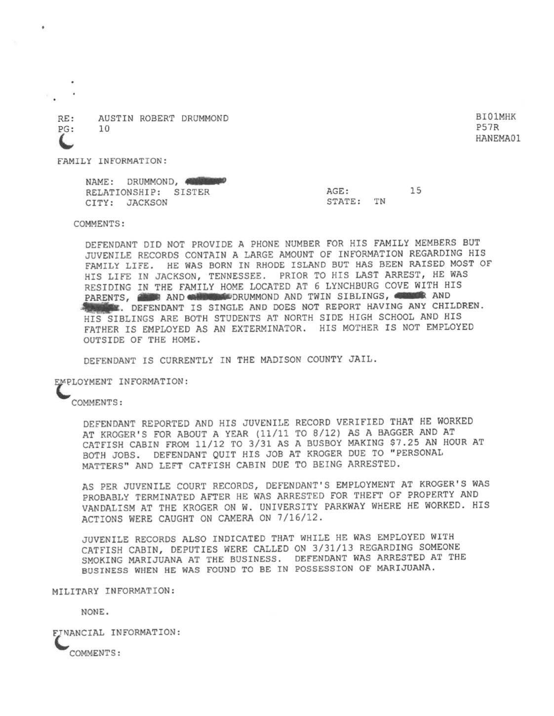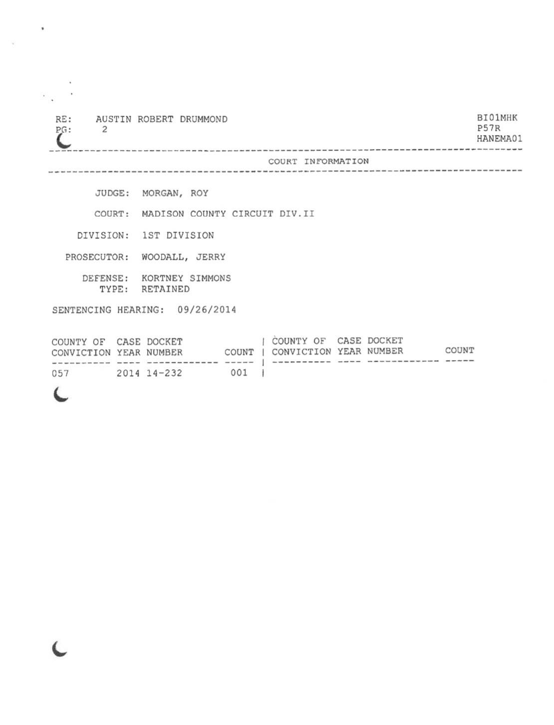 - 8:15 AM: Austin Drummond appeared in court, judge ordered no bond. Judge Andrew Cook entered a not guilty plea on behalf of Drummond due to Drummond not having an attorney at this time. Prosecutors announced they would seek the death penalty. Hearing: Source