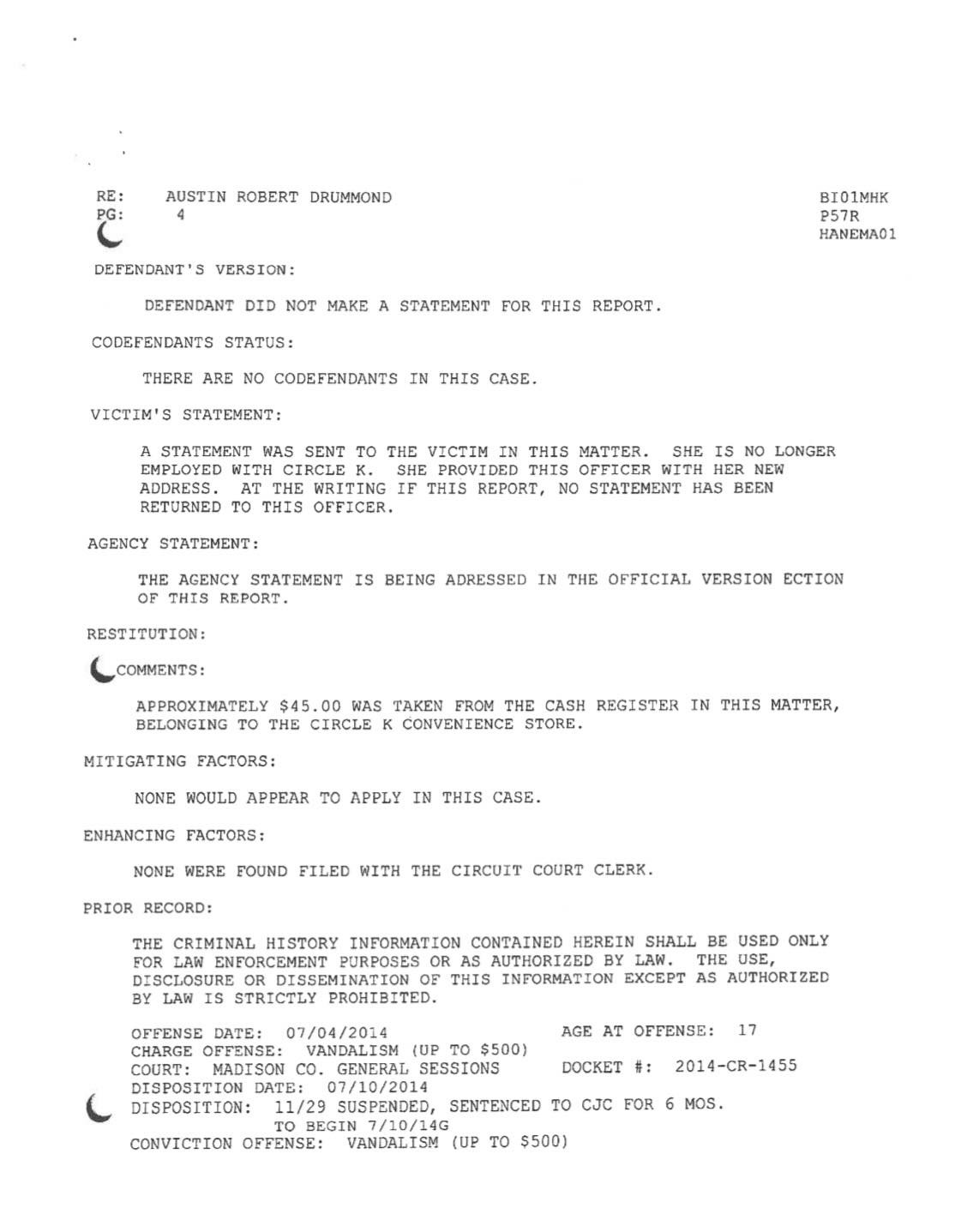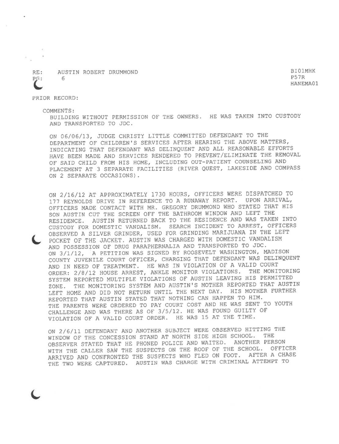 - Authorities have obtained warrants charging Austin Robert Drummond with:
