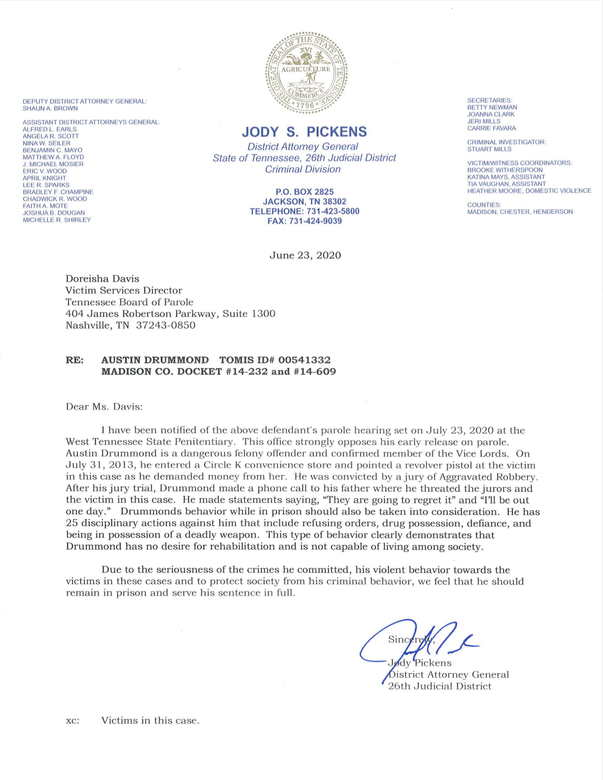 - Drummond was scheduled for a parole hearing on July 23, 2020, but Pickens’ office sent a letter to the Tennessee Board of Parole saying it strongly opposed parole, calling Drummond a “dangerous felony offender.” He did not receive parole then, but was released September 2024 from Northwest Correctional Complex in Tiptonville after serving mandated portions of his sentence, according to Goodman, the district attorney for Dyer and Lake counties.