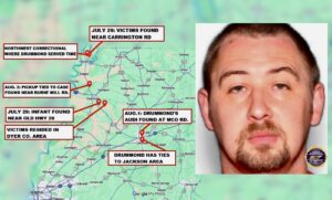 On July 29, authorities began investigating after someone abandoned an infant in a car seat outside a stranger’s home near Old Highway 20 in the Tigrett area. The Dyer County Sheriff’s Office said a dark-colored minivan or a white mid-size SUV dropped off the infant around 3:11 p.m. A witness saw the baby and called 911. Emergency crews responded and evaluated the baby, who appeared to be safe, officials said. The infant was later identified. When referring to the incident days later, authorities said “they” dropped off the child, seeming to imply that another person may have been with Drummond when the child was abandoned. Officials called leaving the infant in the yard a “sign of compassion” and said that “they” brought attention to the child before fleeing. Authorities appealed to that “compassion,” hoping to convince Drummond to turn himself in.