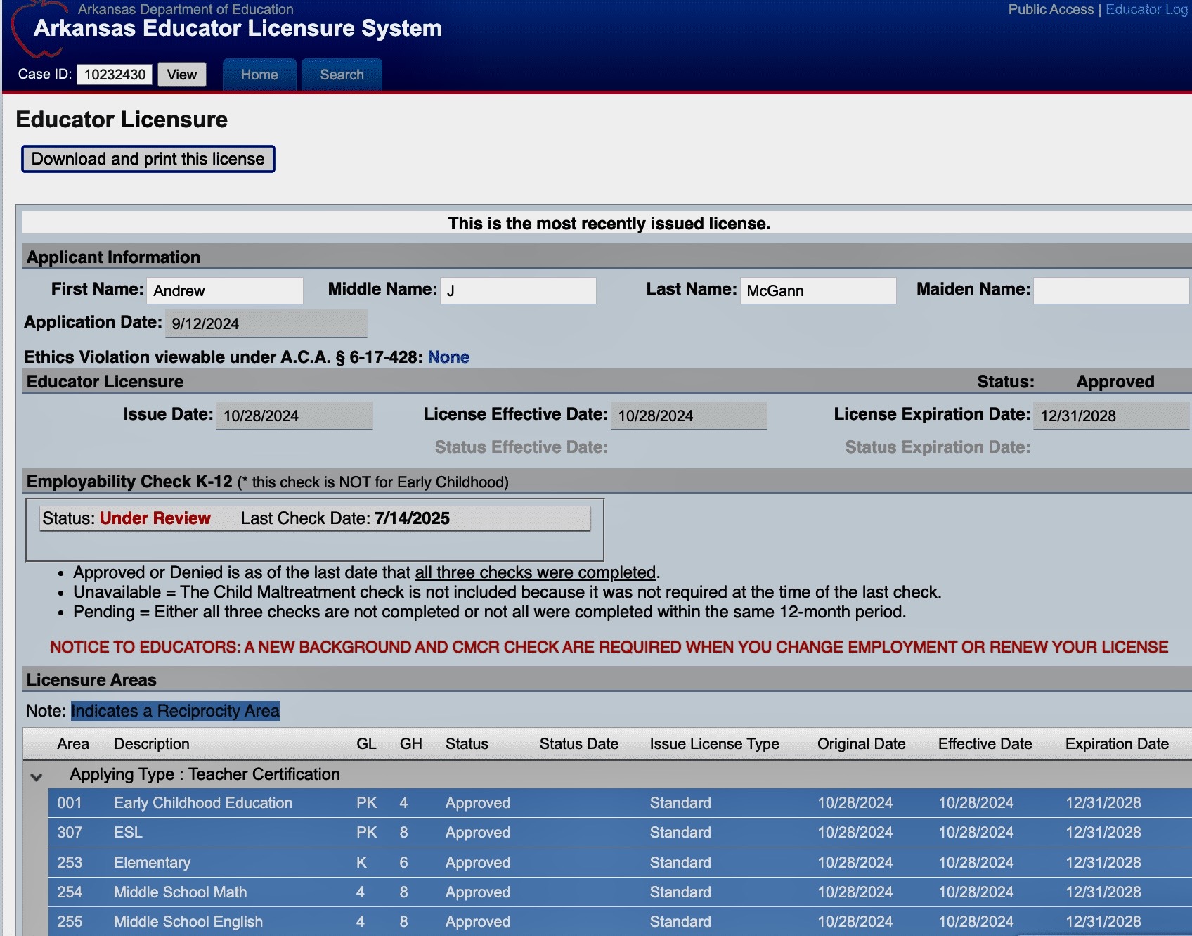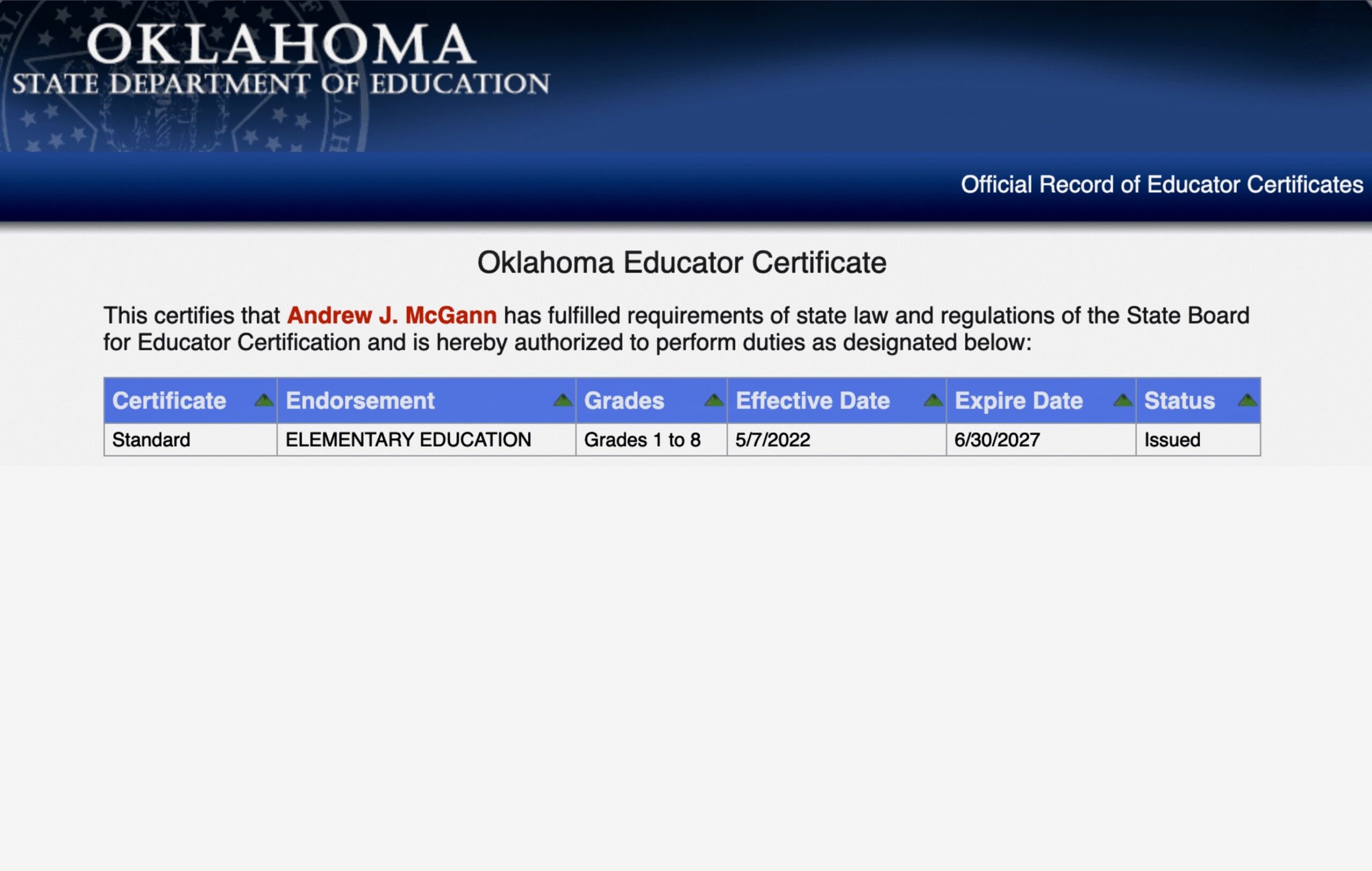 - May 7, 2022 Andrew James McGann obtained an Oklahoma Teaching Certificate Source