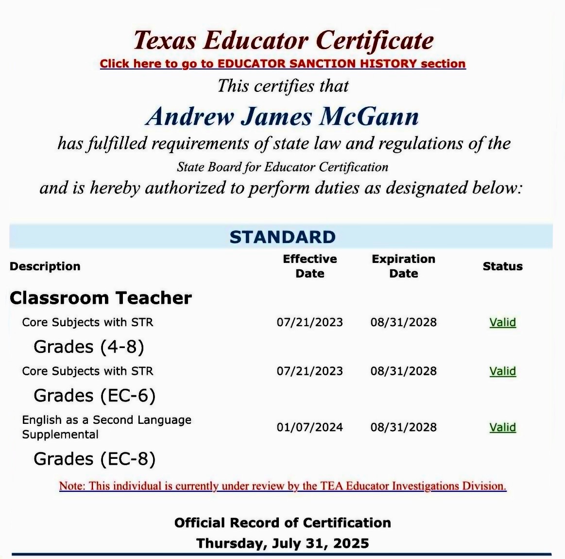 - July 21, 2023: McGann obtained a Texas Educator Certificate with effective date July 21, 2023, and expires on August 31, 2028. Records show McGann had a Dallas address, and it is believed he worked at the school in Flower Mound in 2023. Source