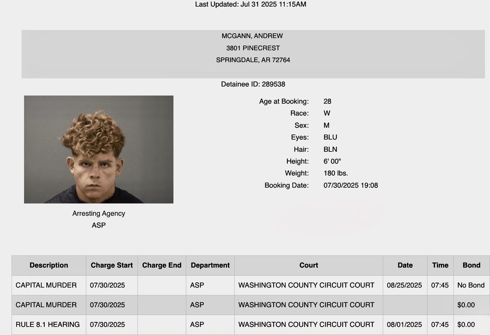 Arkansas State Police Special Agents have arrested James Andrew McGann, 28, of Springdale. He’s been charged with two counts of capital murder in the deaths of Clinton David Brink and Kristen Amanda Brink. Clinton and Kristen were killed on Saturday, July 26, 2025, at Devil’s Den State Park. The suspect was taken into custody this evening at 4:57 PM at a business in the Springdale area