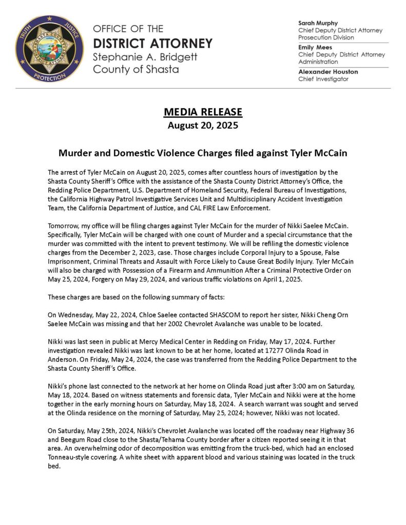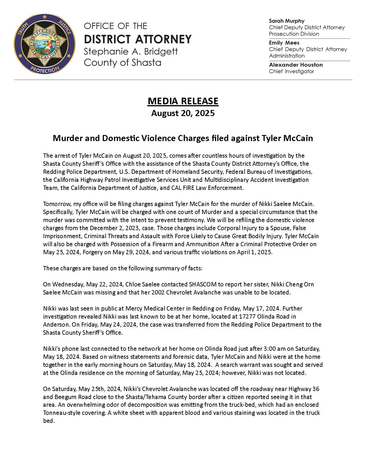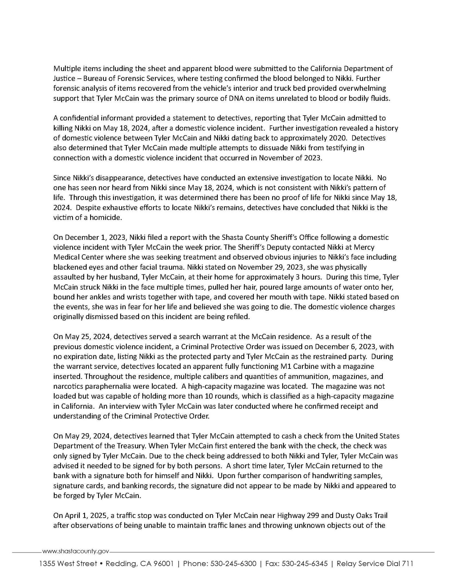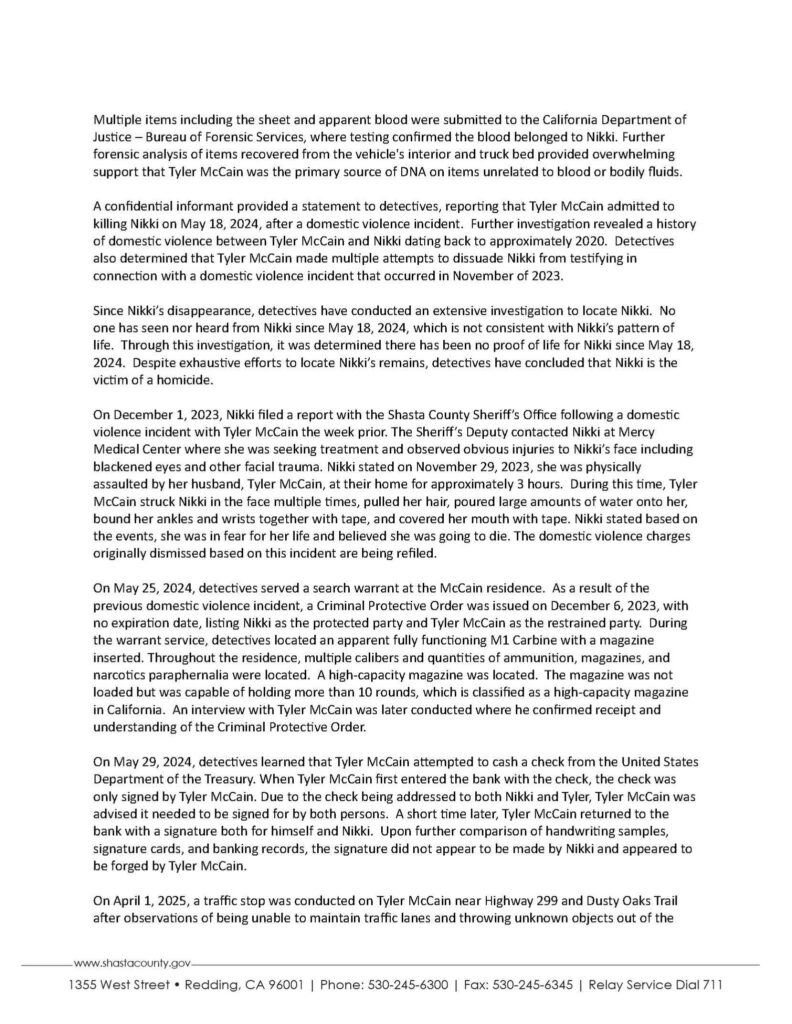 • Tyler McCain is charged with one count of Murder and a special circumstance that the murder was committed with the intent to prevent testimony, Corporal Injury to a Spouse, False Imprisonment, Criminal Threats, Assault with Force Likely to Cause Great Bodily Injury, Possession of a Firearm and Ammunition After a Criminal Protective Order, Forgery, and various traffic violations. Source