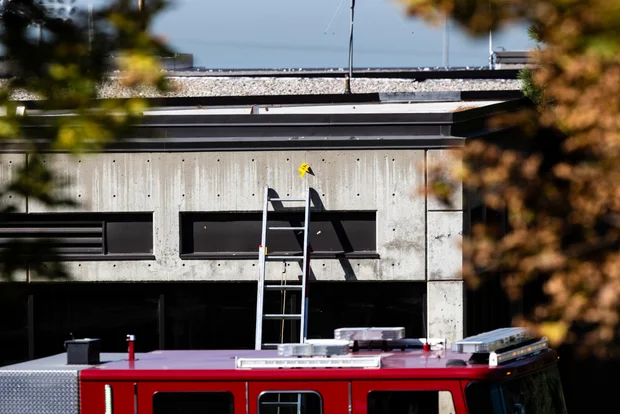 - Evidence markers are placed on the roof and side of a building at Utah Valley University.