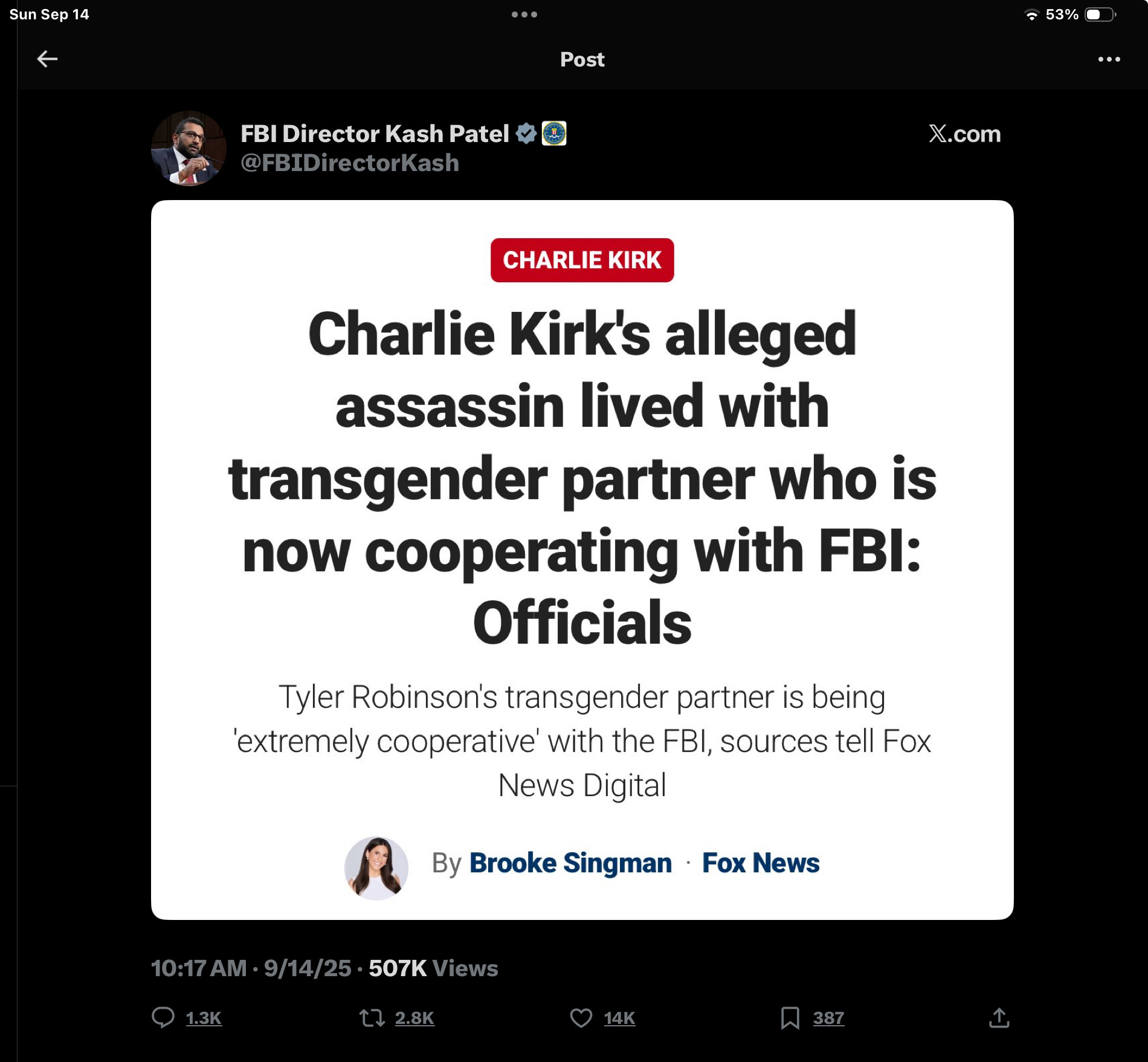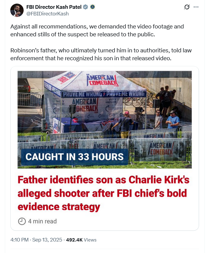 - 9:58 AM FBI released new images and asking for the public’s help identifying this person of interest in connection with the fatal shooting of Charlie Kirk Source