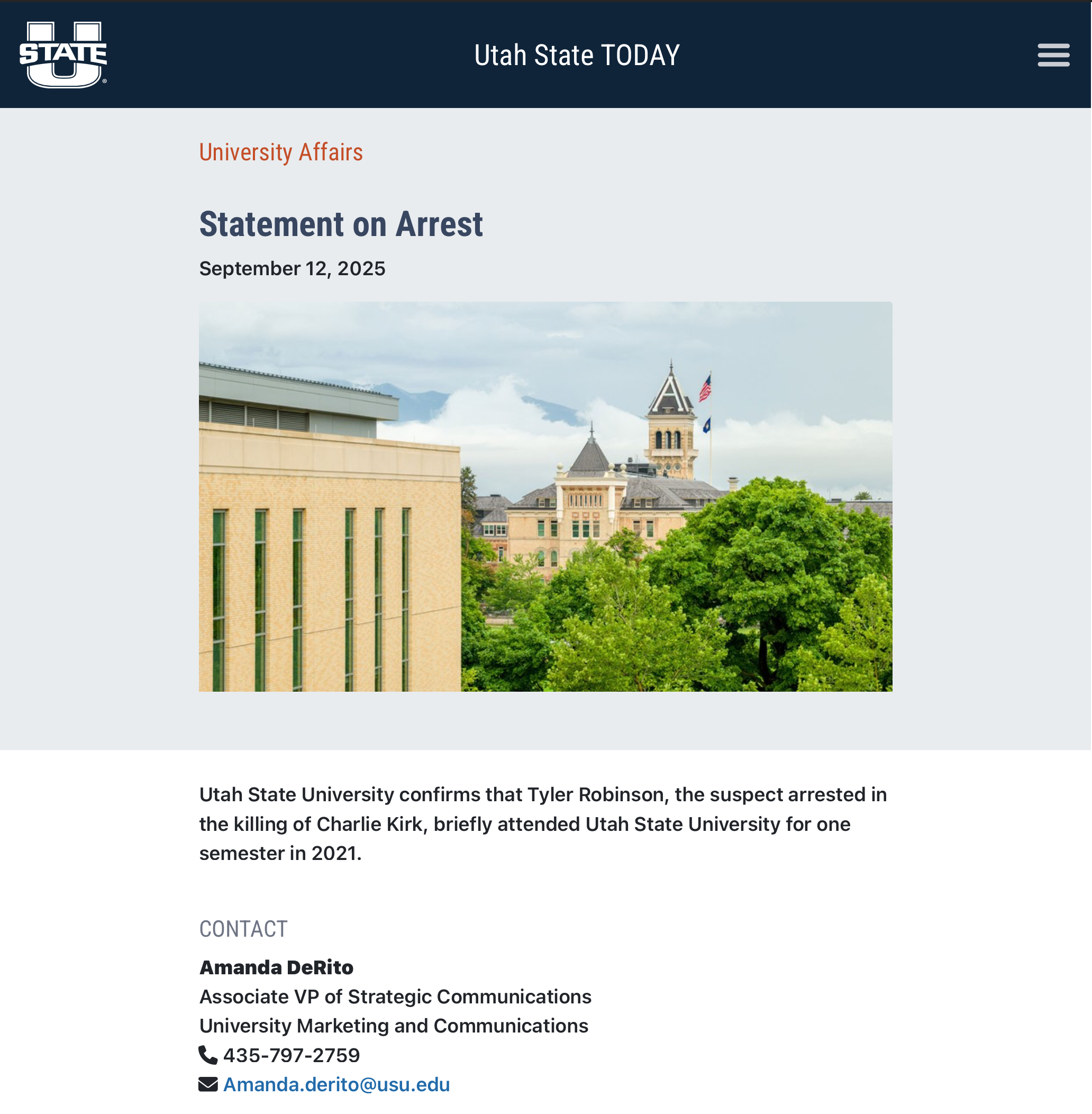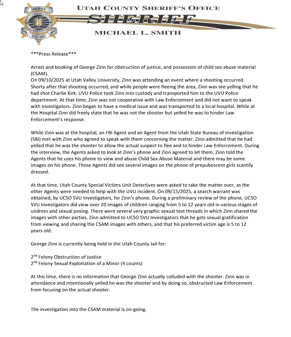 - During a shooting at UVU, George Zinn yelled that he had shot Charlie Kirk. Source