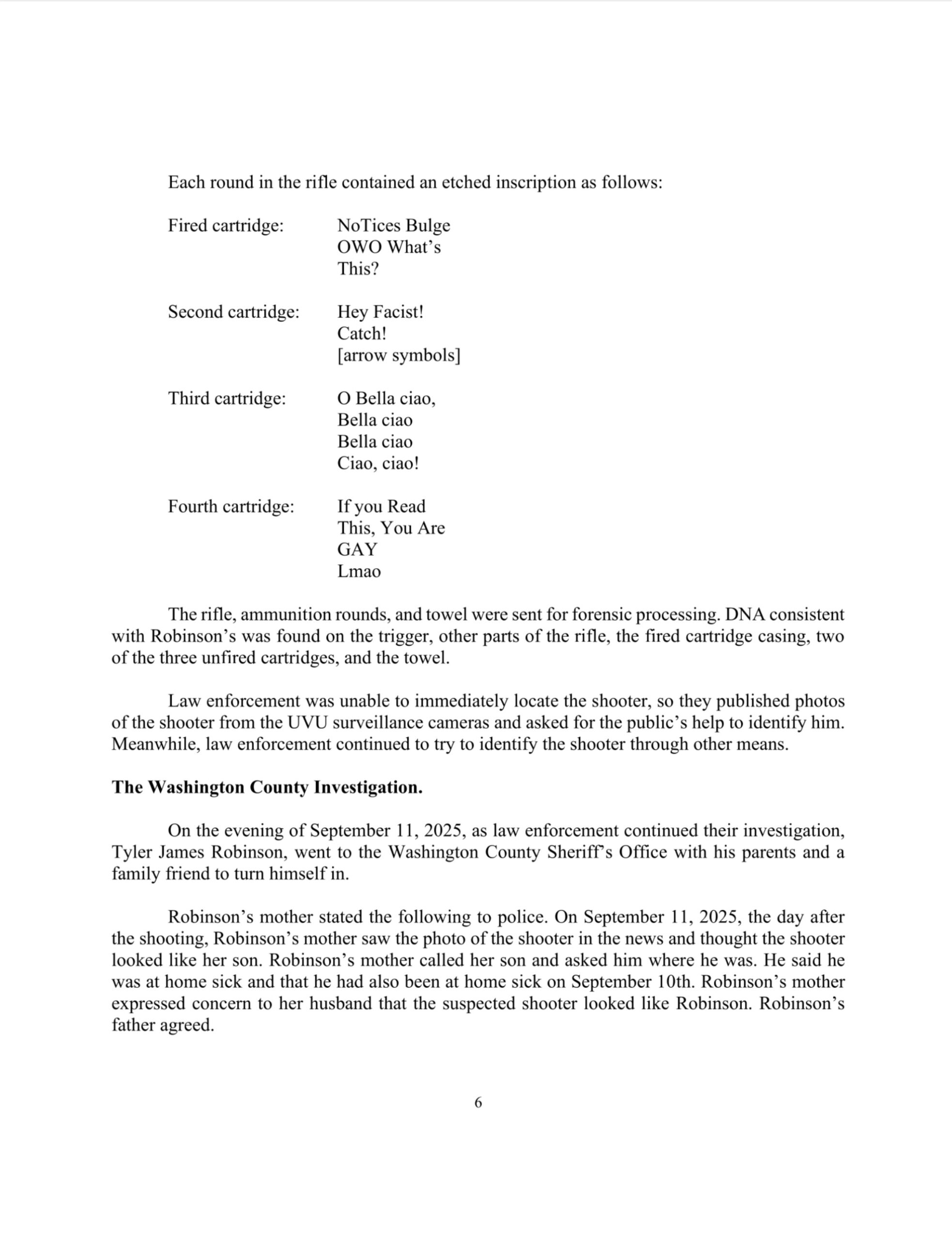 - Discord messages reviewed by investigators indicated that the shooting suspect engraved writings on bullets he used and that the rifle and scope he used were “unique,” Utah Gov. Spencer Cox said at a news conference this morning.
