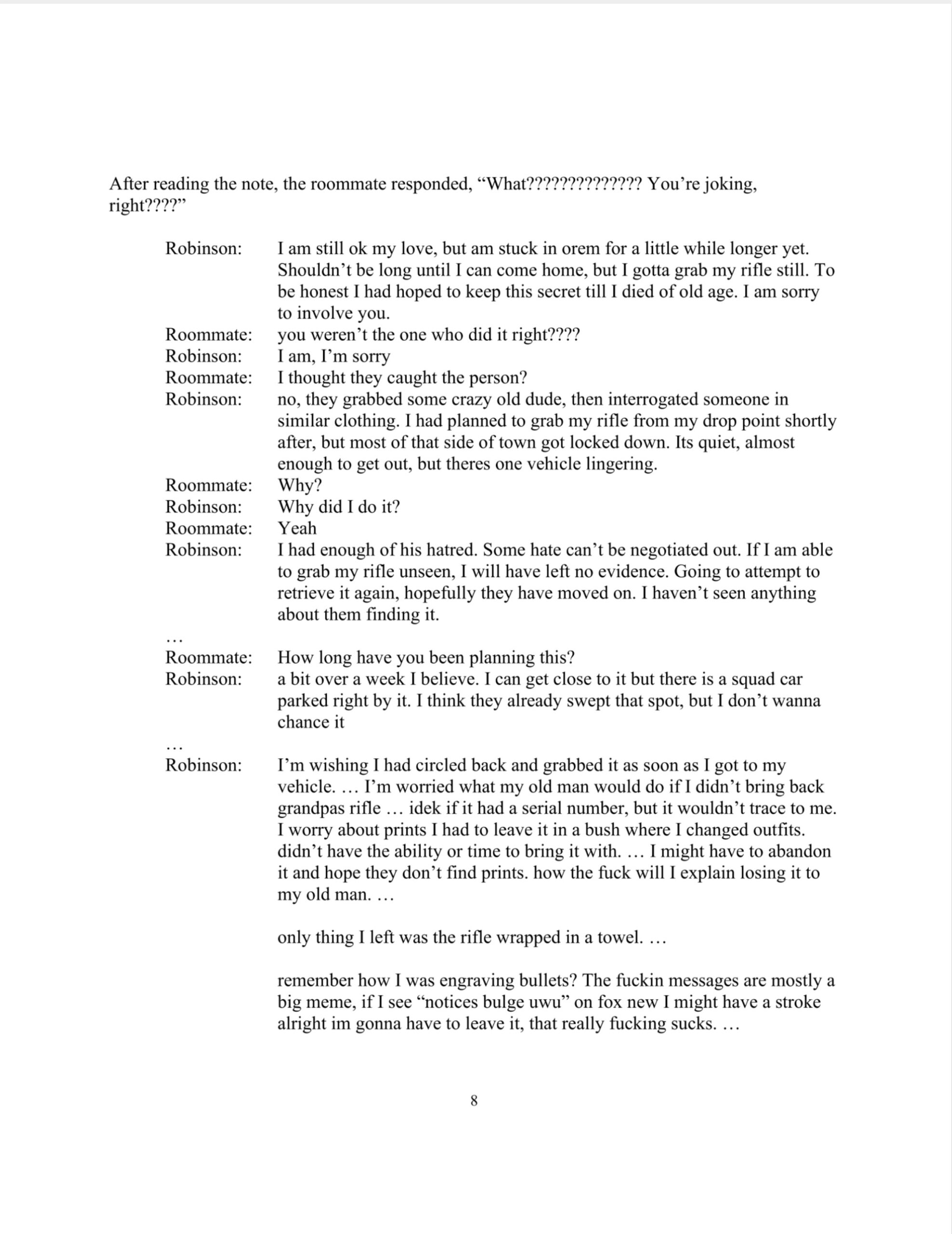 Investigators later found Discord messages in which Robinson discussed retrieving a rifle from a “drop point,” wrapping it in a towel, engraving bullets with slogans, and noting the uniqueness of his rifle and scope. These communications suggested an intent to carry out a politically motivated act of violence.