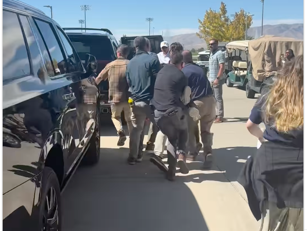 - 12:23:20 p.m. – Kirk is lifted and carried by staff and attendees away from the podium.